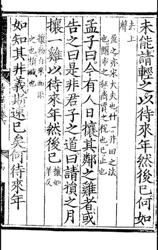 资料图片:明代成化年间刊本《孟子集注》 书影,这一页展示的是“月攘一鸡”的故事。