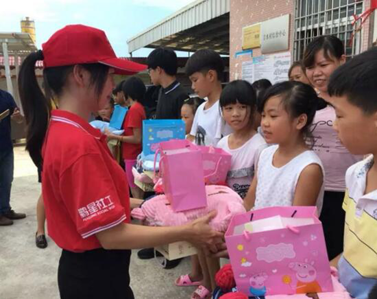 8月7日,活动第一站来到阳江市阳东县大八镇吉水村。该村经济水平低下,青壮年外出务工,只有老人和小孩。在当地捐赠仪式上,社会组织代表向24名孩子送上由“牵手行动”阳江组10家社会组织自筹的爱心物质,包括抱枕被、文具套装、毛巾套装等。