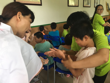 在云浮市云安区博华残疾人综合服务中心,住着一群特殊儿童,他们虽然残疾或智力低下,但却渴望学习、渴望被爱。志愿者们首先对全体老师、护理员及智力正常的儿童进行手卫生、预防手足口病相关知识的指导及健康教育,在场的师生们积极参与;紧接着,志愿者看着中国南丁格尔志愿护理服务总队佛山市第一人民医院分队的志愿者录制的洗手视频,重复练习六步洗手法。活动希望通过老师、护理员及智力正常的孩子们带动整个服务中心的孩子,养成良好的卫生习惯。紧接着志愿者们亲身示范培训儿童心肺复苏知识,通过一对一辅导、答疑、现场练习和考核,老师基本能正确地完成单人徒手对儿童进行心肺复苏术,当儿童突发意外时,老师懂得在向120救助的同时,第一时间现场施救,将能为抢救生命赢得时间。另外志愿者们还手把手教老师瘫痪儿童的手法康复。老师们纷纷反映这是一场实用的、适合需要的知识盛宴。