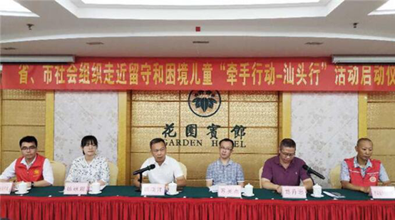 7月30日,由汕头市民政局组织的省、市社会组织走近留守和困境儿童“牵手行动—汕头行”活动启动暨授旗仪式在汕头举行。此次活动为期3天,省、市共18家社会组织将分组实地走访慰问澄海、潮阳、潮南区和南澳县等共6个镇29个村居的128名留守儿童和困境儿童,以及市儿童福利院的孤儿,各家结合自己的优势,开展相对应的服务和帮扶。本次关爱慰问留守和困境儿童的物资(包括捐赠图书角、学习用品、生活物品等)和现金总价值约12万元。